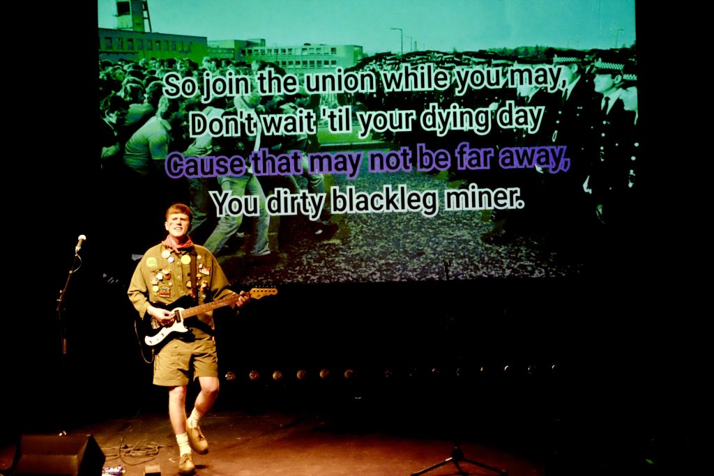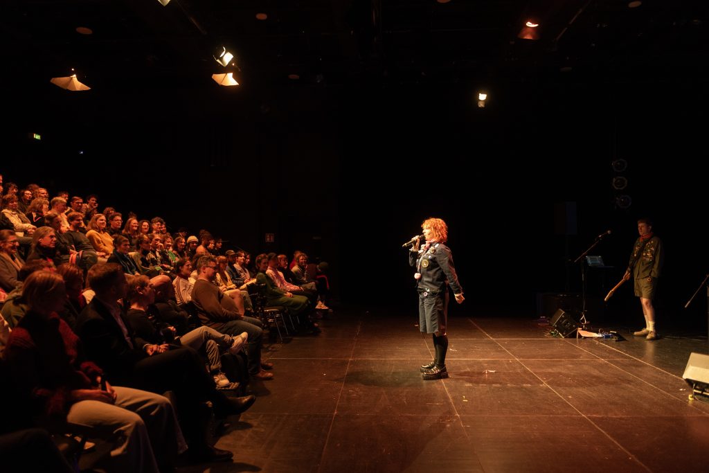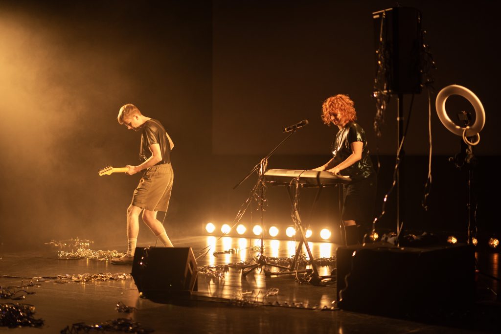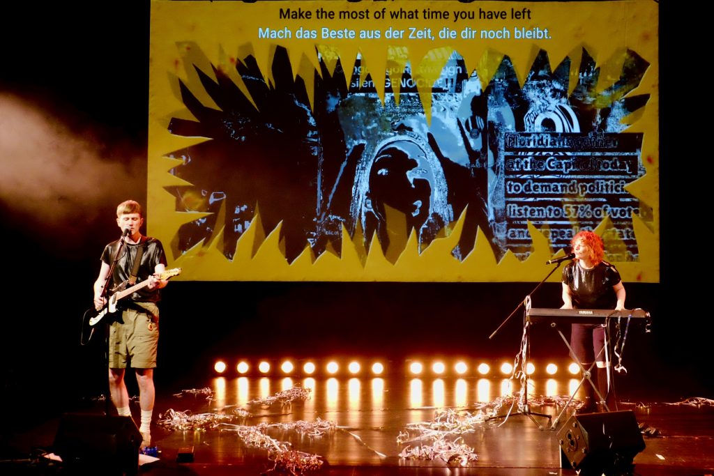 “The full blast! At the Theater Rampe, the party goes off in front of the screen with catastrophic news. Calum Perrin rocks the guitar riffs, Ada Mukhína bangs out the electro-pop melody on the keyboard. Wild, punky, until the final chord suddenly hits, the video stops, and ‘System Error’ appears on the screen. Grande finale at the start? Ada, a theatre maker born in Saint Petersburg and living in Berlin, thanks Calum, a musician from north-east England, and her non-existent colleagues, who were not paid: ‘the bass, the organ and everyone backstage’. The audience has only just settled into their seats! But Ada is packing, Calum is scrubbing. Theatre after cultural cuts… welcome to Ada Mukhína’s School of Survival”.